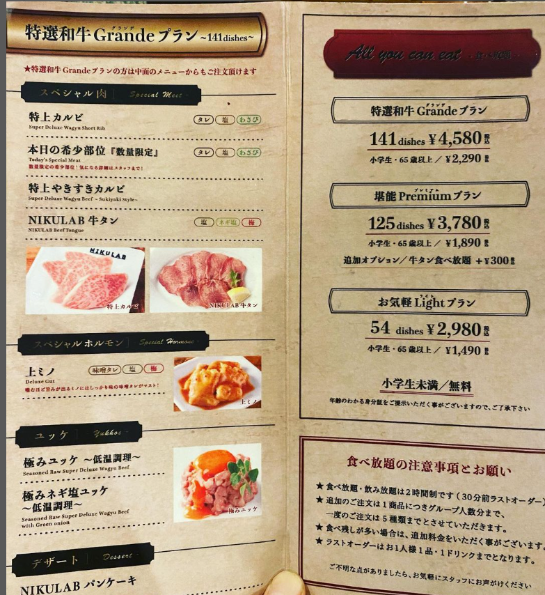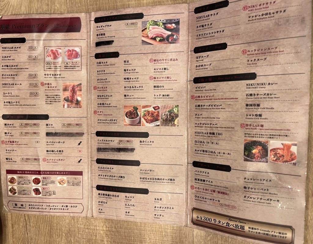 NIKULAB 肉らぼの食べ放題メニューは以下の通りです。