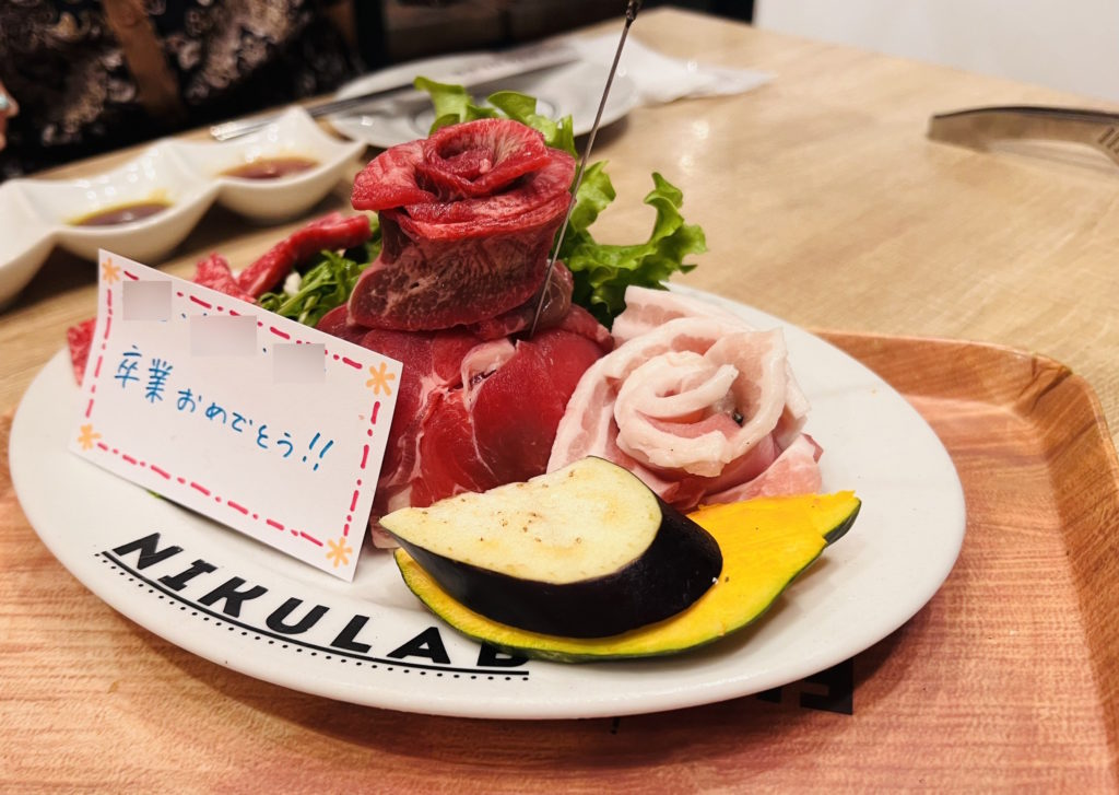 NIKULAB 肉らぼはお祝いプレート・お祝い肉ケーキ(2,000円)などがあり、誕生日や卒業、入学などのお祝いにメッセージをつけてくれるサービスもあります。
