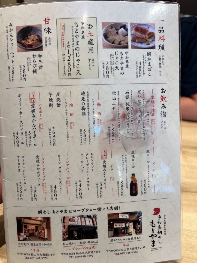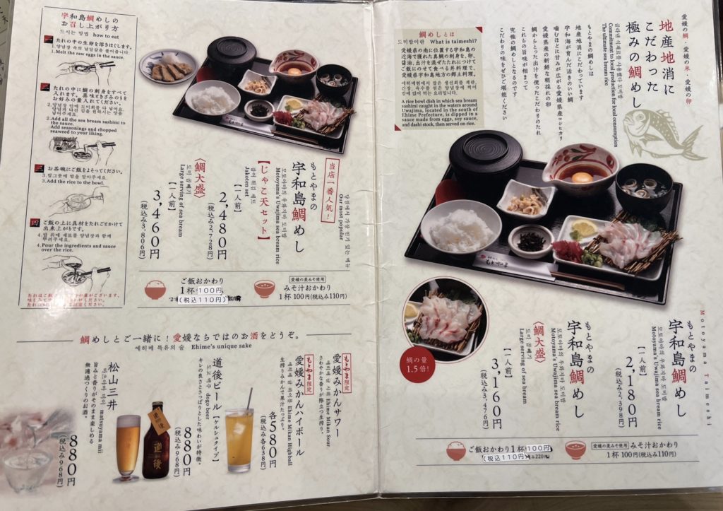 宇和島鯛めし もとやま本店のメニュー(税込)
