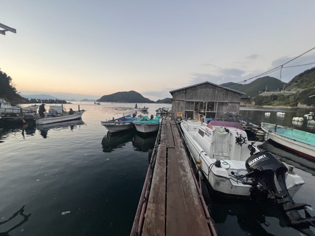 釣りのポイントは塩子島より手前のおだやかな湾内で、真珠いかだのブイにロープをくくりつけてのかかり釣りです。生簀のかかり釣りは禁止です。