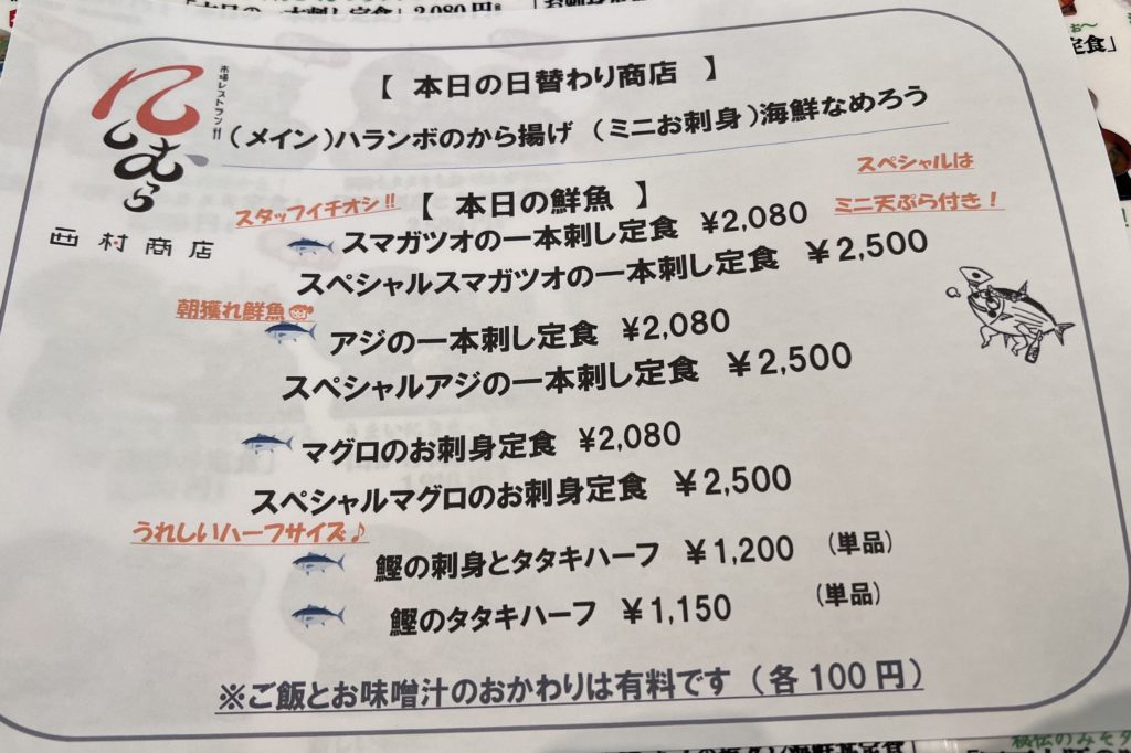 看板メニューの海鮮系定食は、高知の市場から直送されたばかりの旬の魚が中心です。