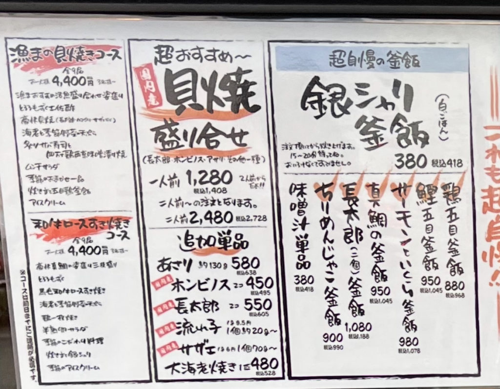 - ご膳:(銀シャリ釜めし・茶碗蒸し・味噌汁・小鉢・漬物・甘味):1,870円~