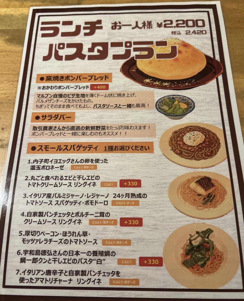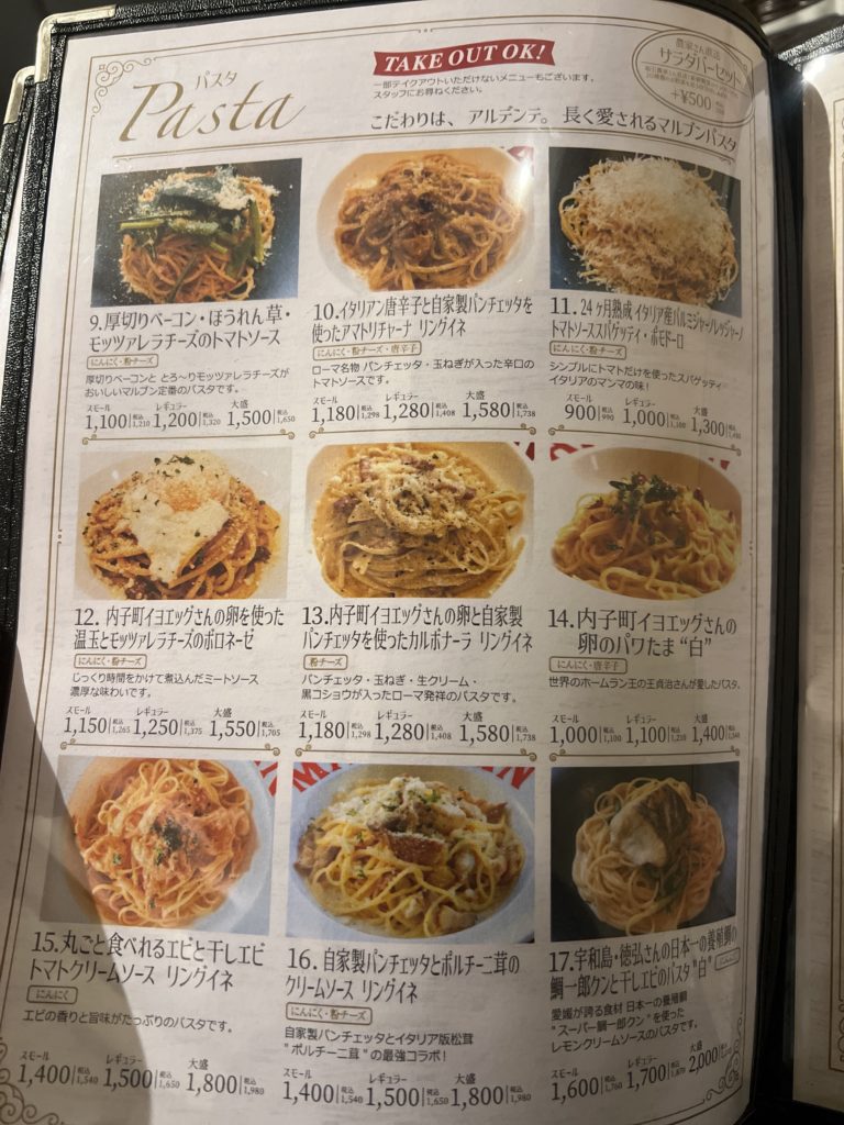 5人の場合は2人で1つ・3人で1つ注文し、3人で1つのパスタは大盛りといった感じです。