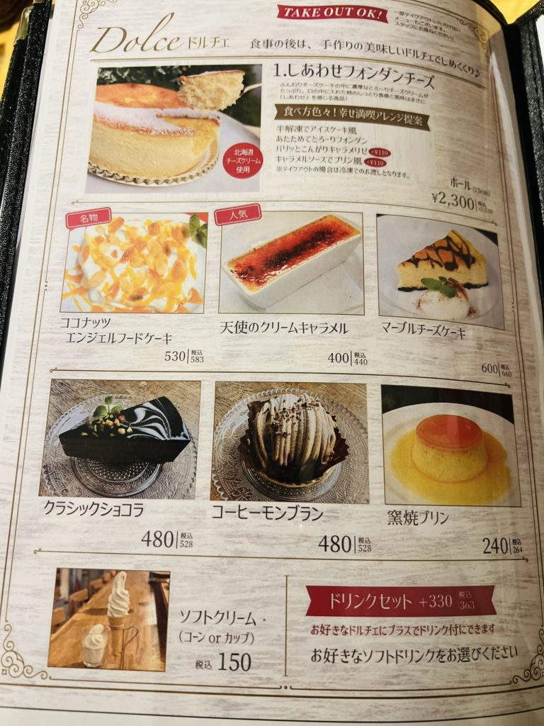 - ドルチェ: 窯焼プリン、天使のクリームキャラメル、スタッフおすすめアイス、ソフトクリーム
