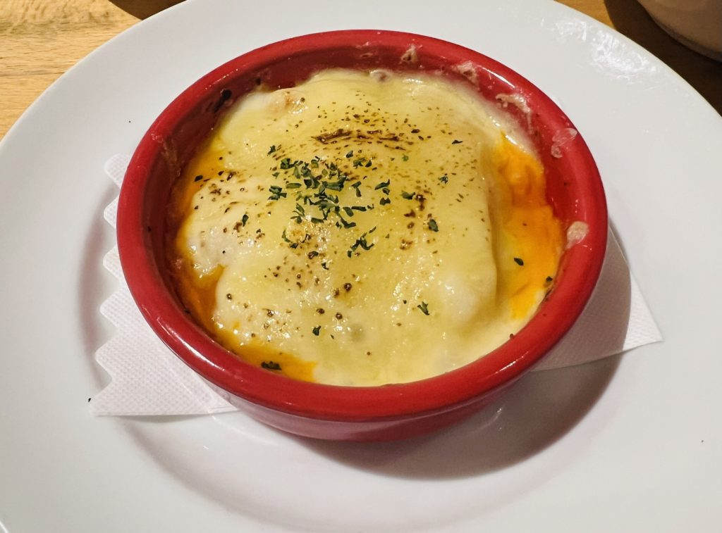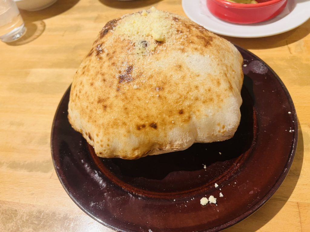 表面にはパルメザンチーズがかけられており、噛むほどに小麦の旨みとチーズの塩気が口の中に広がります。