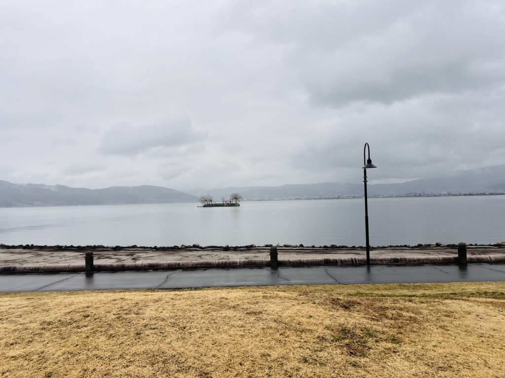 立石公園に到着した時はあいにくの曇り空でしたが、どんよりとした雲の下に広がる諏訪湖は幻想的で、映画のワンシーンのような独特の迫力がありました。
